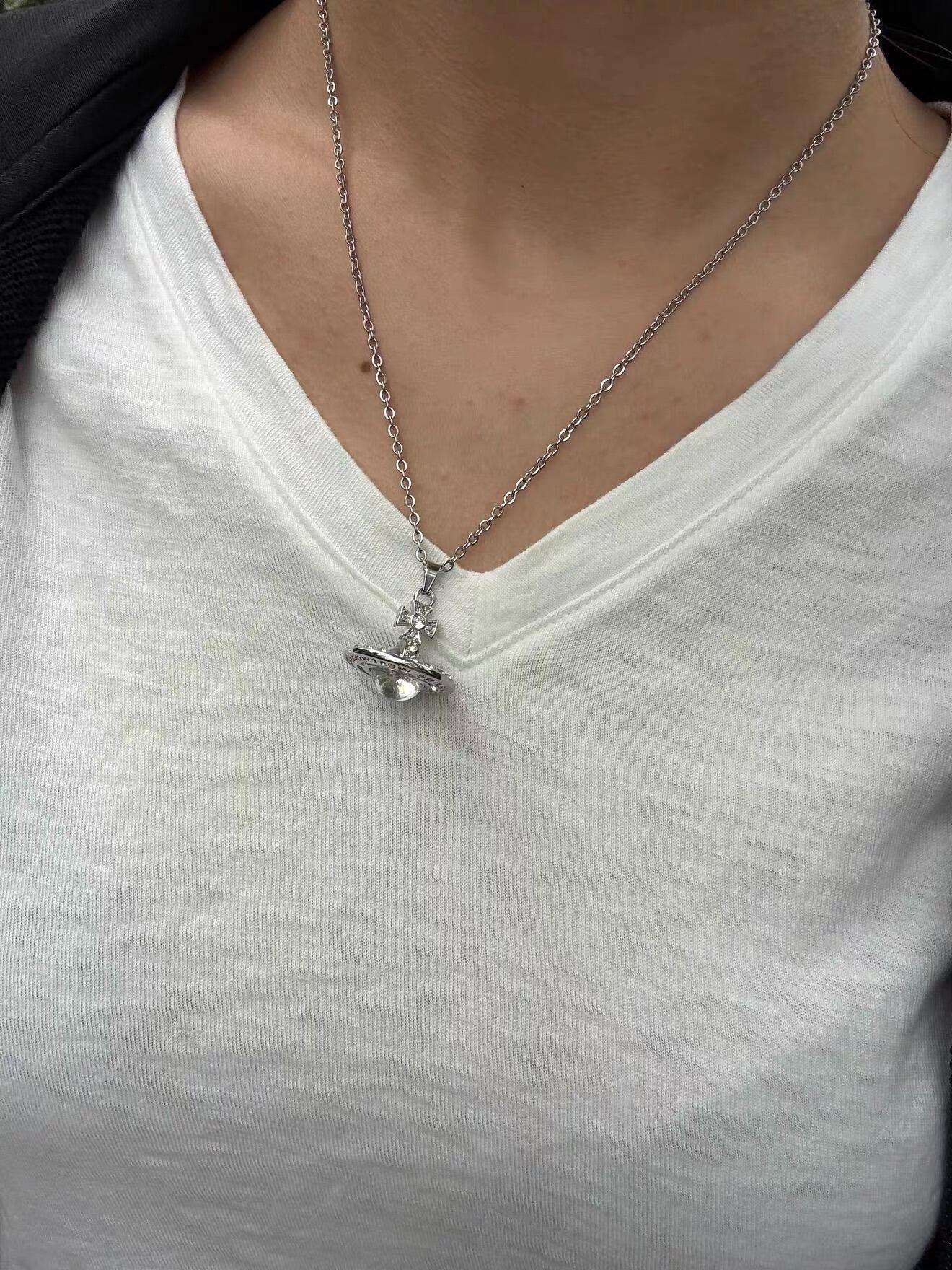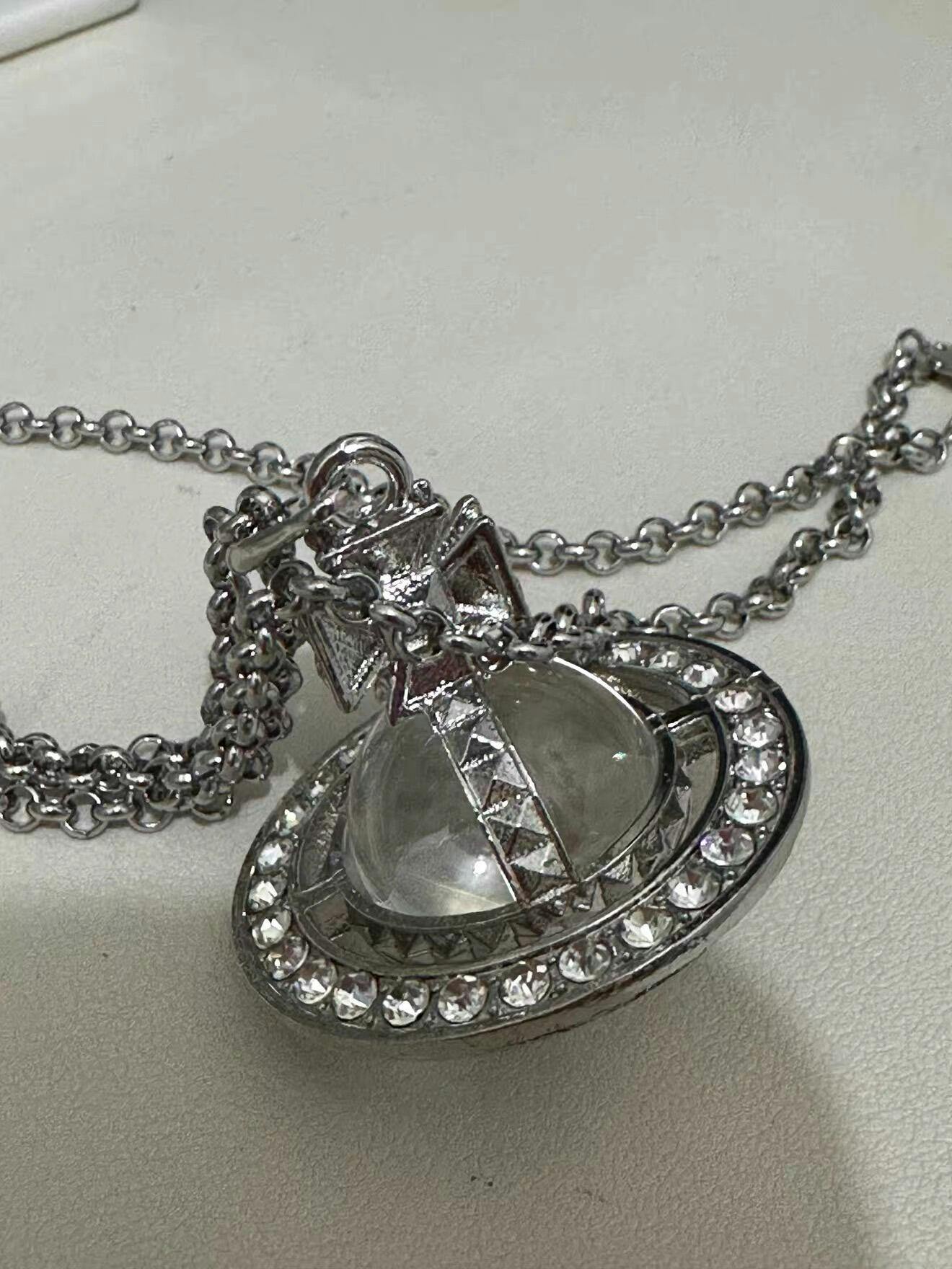 The Vivienne Westwood Orb Pendant necklace features a sculptural three-dimensional crystal-clear orb at its centre, finished with shimmering crystals.