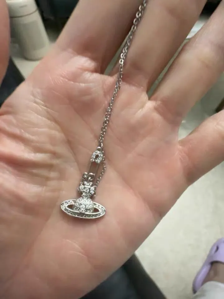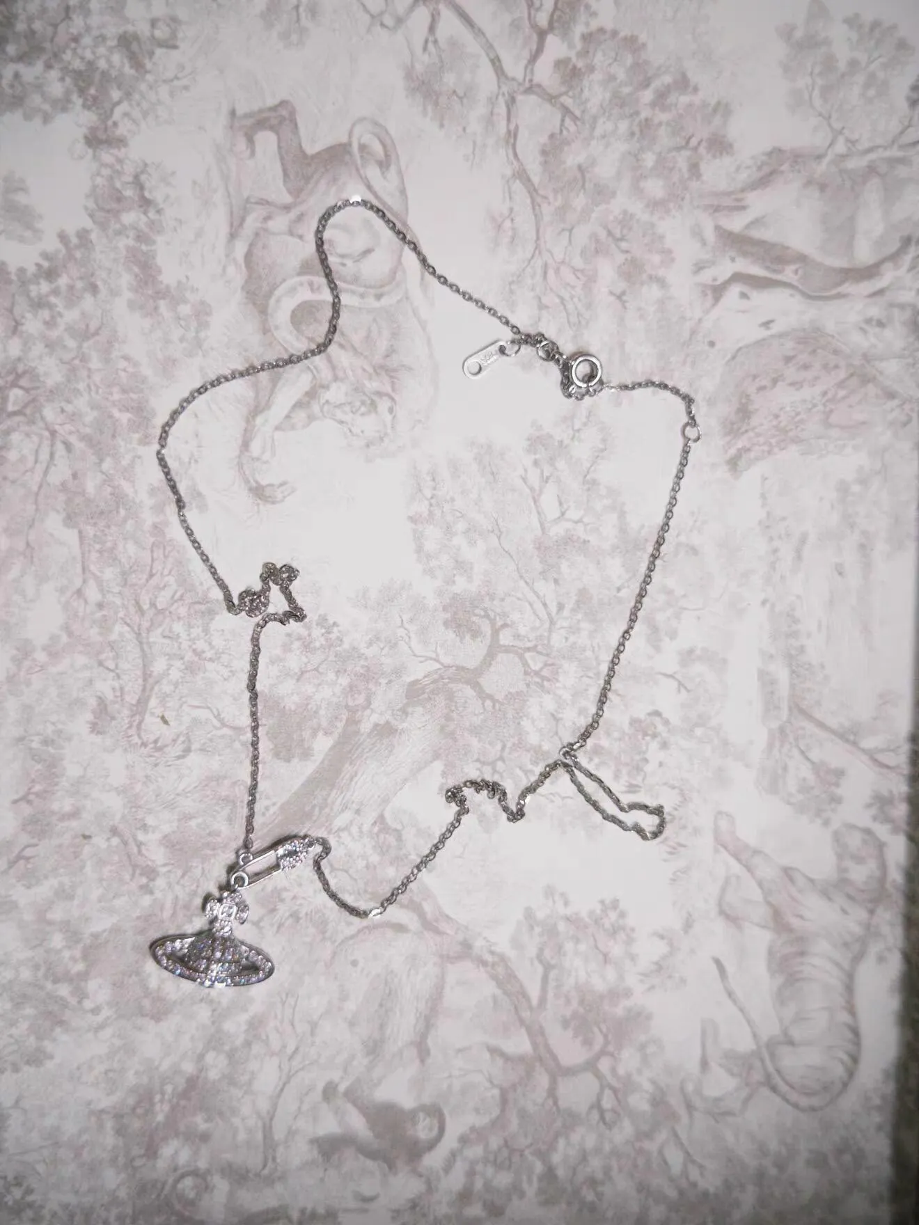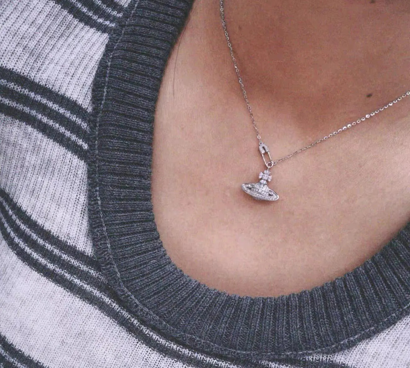 The Vivienne Westwood Lucrece Pendant necklace features crystal embellishments in polished silver tone, adorned with the signature safety-pin motif and the iconic orb design.